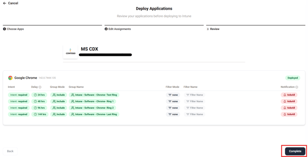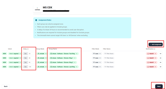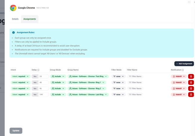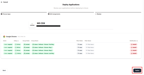 When deploying an app, you can set rings for deployment. App ring deployment enables organizations to roll out applications in stages, reducing risk and improving reliability. By assigning users or devices to specific deployment rings, IT can test updates with smaller groups before expanding to the wider environment.