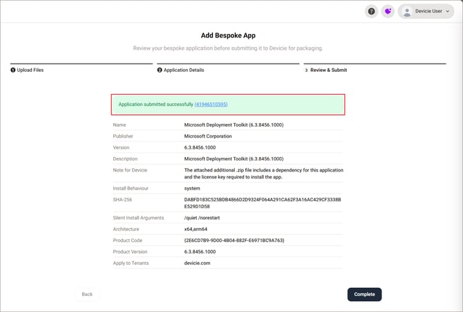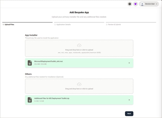 The bespoke application request form has been redesigned to streamline the packaging process. This new process integrates directly with the Devicie dashboard, utilizes automated detection to reduce manual input, and simplifies the submission of installation media.