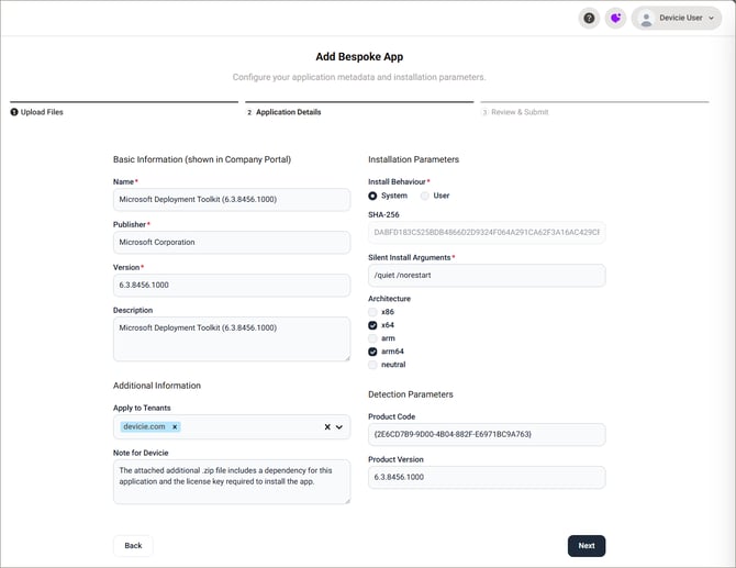 Automated Detection: Uploading MSI or supported EXE files automatically prefills application details, including: