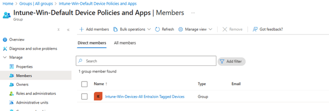 Place the “Intune-Win-Devices-All Autopilot Devices” inside the group “Intune-Win-Default Device Policies and Apps”