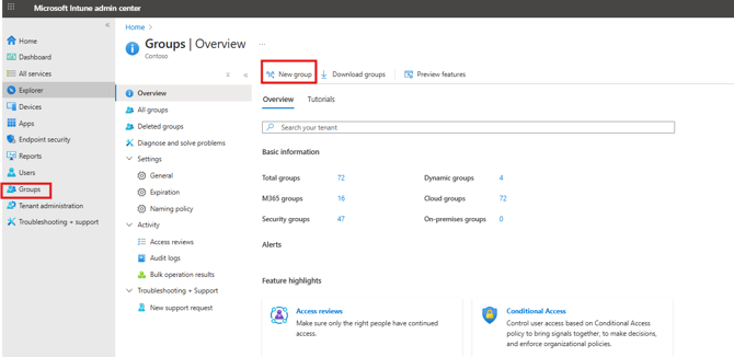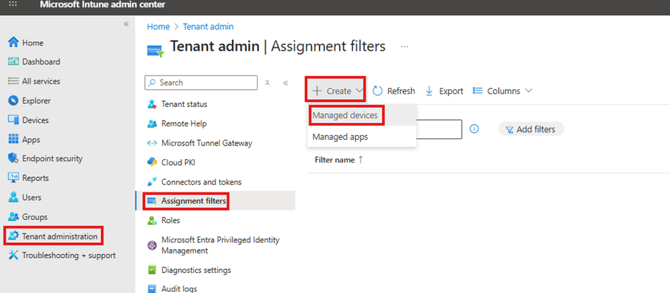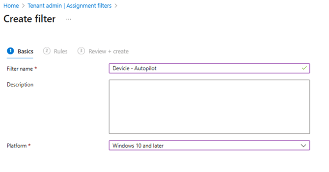 In the following steps you will set up two groups and a filter. These groups and filter are used to create a separation from the current Intune environment to allow for test and then allowing for a more robust set up for future use.