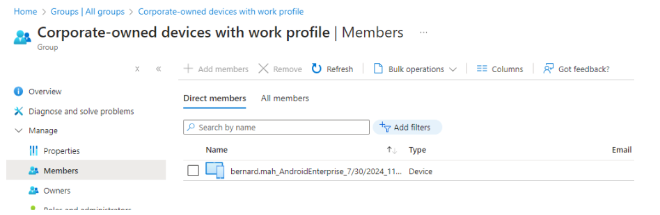 24. After device has been enrolled and registered, navigate back to the Microsoft Intune groups to view Corporate-owned, fully managed user devices.