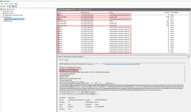 SCEP Certificate enrollment for Local system via https://URL.msappproxy.net/certsrv/mscep/mscep.dll/pkiclient.exe failed:
