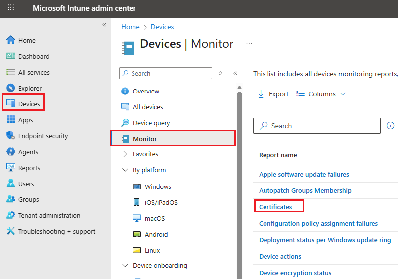 Navigate to https://intune.microsoft.com/, Select Devices then select Monitor then select Certificates