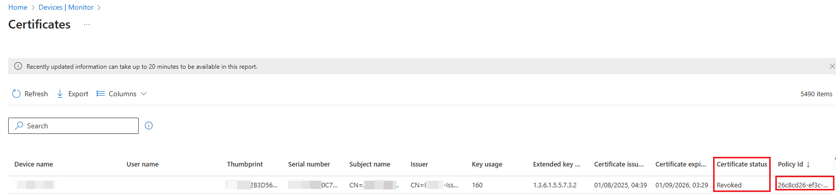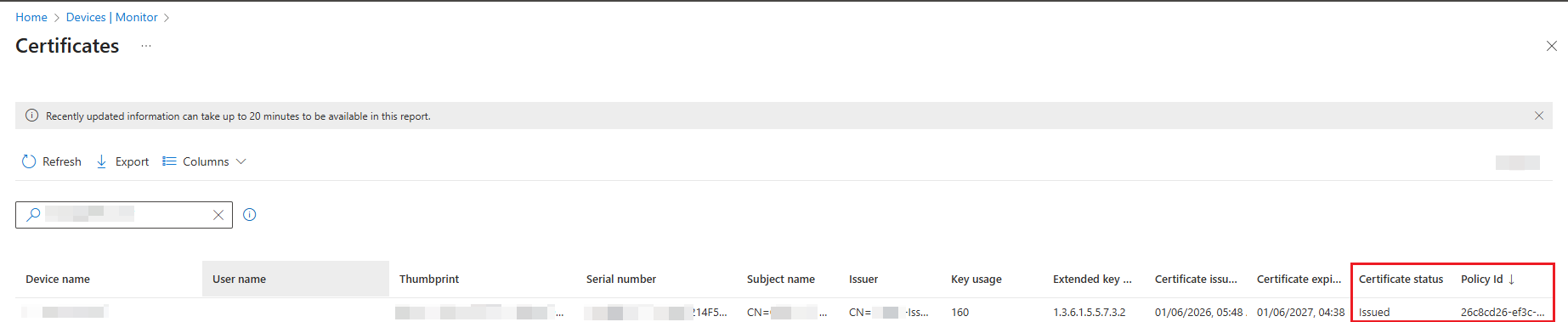 At the same time, navigate to https://intune.microsoft.com/, Select Devices then select Monitor then select Certificates which shows "Issued".