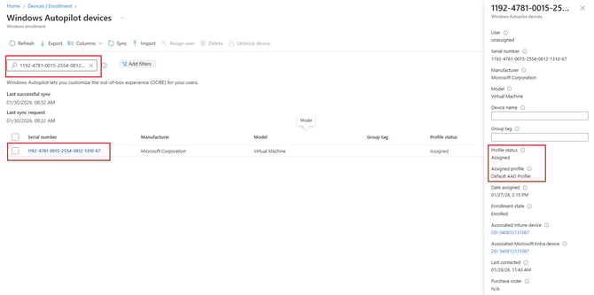 2. Enter in the serial number in the search panel, click on the Serial number and make sure the profile is assigned