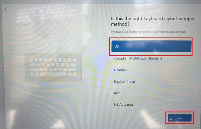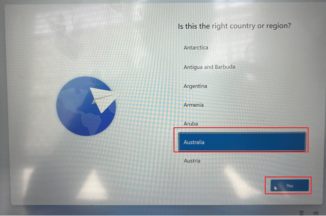 3. Once the S/N has been assigned, turn on the device which will bring you into OOBE (Out of box experience). Select your Country then select Yes.