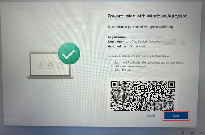 10. It will advise you that it is going to do the pre-provisioning task and which profile is assigned to that Serial number. Select Next.