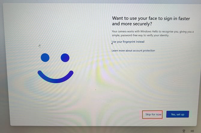 15. It will display with “Preparing Windows” and bring you to be prompted to setup Windows Hello for face recognition, if you wish to skip it, select Skip for now.If you do not have this setting enabled, you can skip this step.