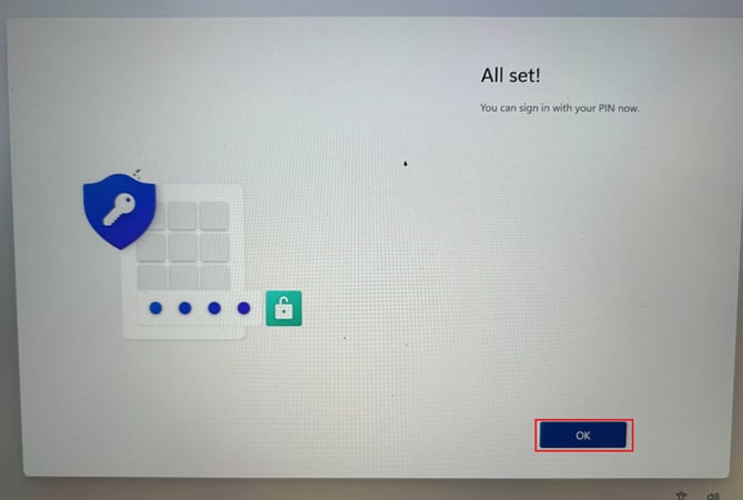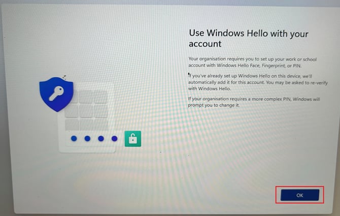 16. You will be prompted to setup Windows Hello for Business PIN, select OK. You will not be prompted for MFA as the previous MFA is still accepted.