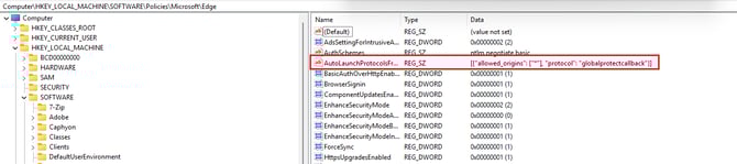 8. Once the policies have been deployed, by checking the registries: HKEY_LOCAL_MACHINE\SOFTWARE\Policies\Microsoft\Edge you will see that AutoLaunchProtocolsFromOrigins has been applied.