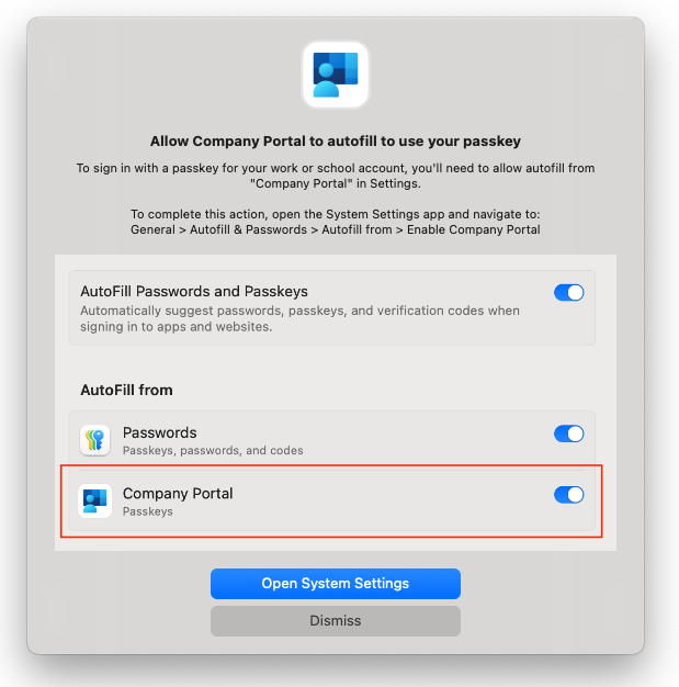 An additional step is required in order to complete Secure Enclave registration - the end-user must approve Company Portal to use Autofill.