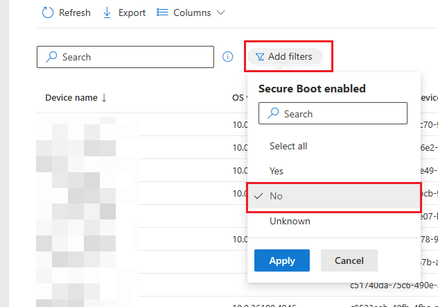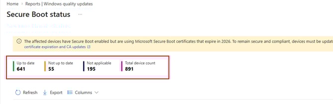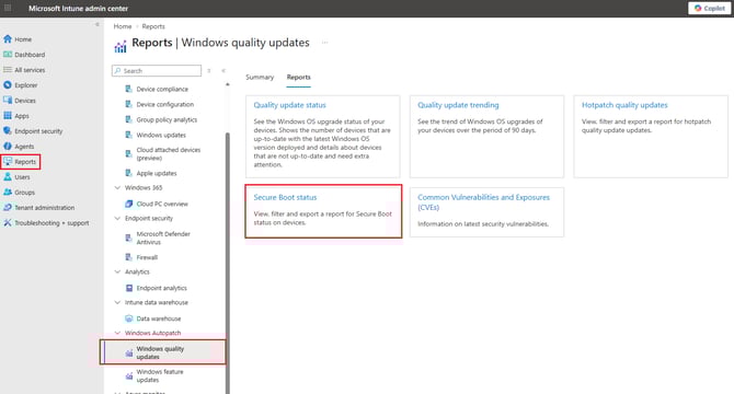 Navigate to https://intune.microsoft.com/ > Reports > Under Windows Autopatch > Windows quality updates > Reports > Secure Boot Status.
