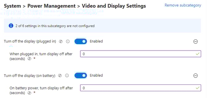 Under Administrative Templates\System\Power Management\Video and Display Settings, select the following: