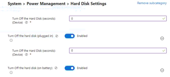 Under Administrative Templates\System\Power Management\Hard Disk Settings, select the following: