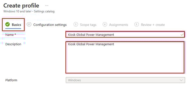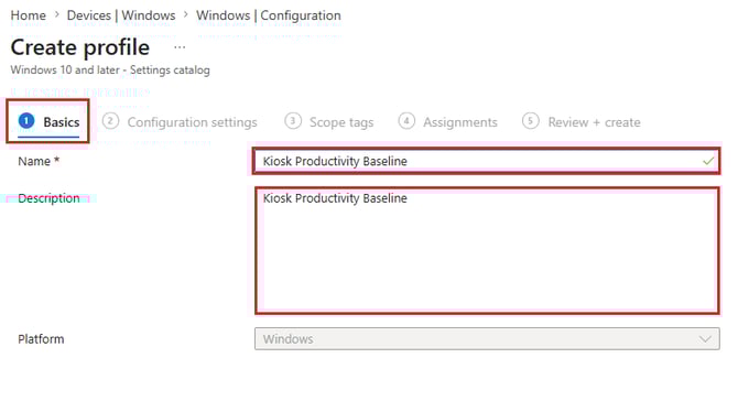 1. By navigating to Windows Configuration Profiles, select Create then select New Policy then select By platform: Windows 10 and later and Profile type: Settings Catalog then select Create.