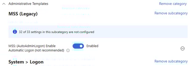 - MSS: (AutoAdminLogon) Enable Automatic Logon (not recommended) as Enabled